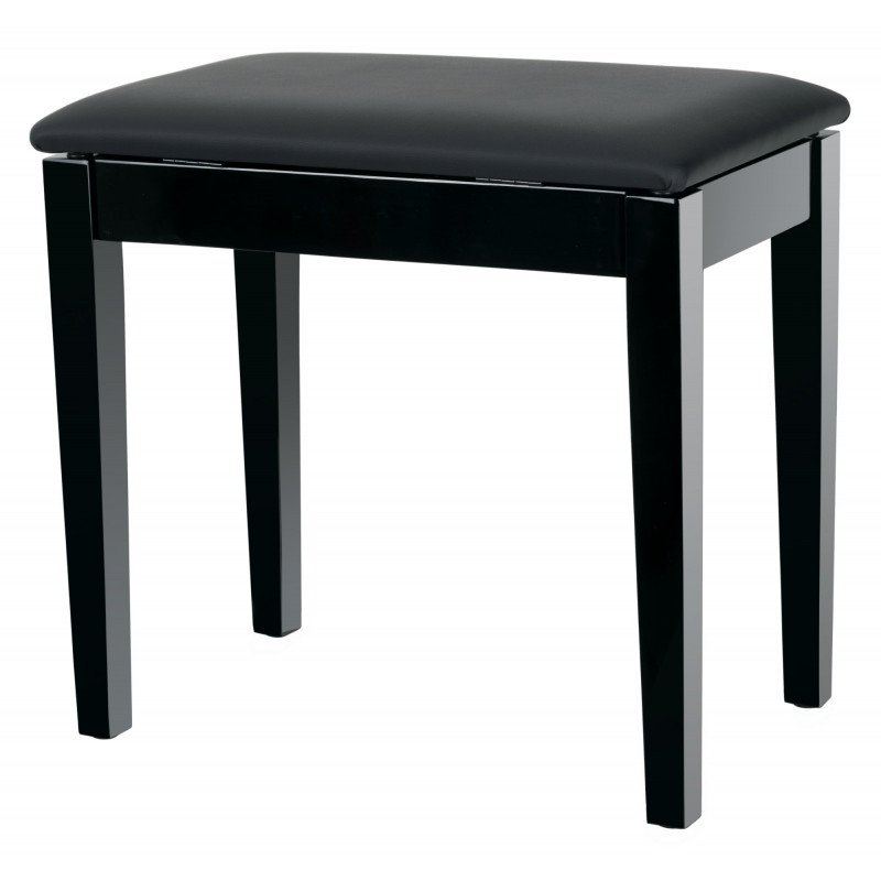 Klavírní stolička s praktickým úložným prostorem v lesklém černém provedení s černým koženkovým sedákem. Rozměry sedáku jsou 53 x 33 cm. Stolička má pevnou dřevěnou konstrukci. Model S má sedák z imitace kůže, který lze odklopit. Vespod je velká odkládací přihrádka na noty a příslušenství. Stabilní připojení patek k rámu zvládnou i neprofesionálové za pár minut. Jediné, co musíte udělat, je připevnit čtyři nohy k rámu každou jedním šroubem. Potřebný nástroj je již součástí dodávky. Gumové nožky na spodní straně chrání podlahu před náhodným poškrábáním.